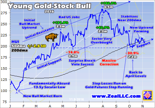 So don’t be misled by the markets’ extraordinary head fake on Trump’s surprise victory. No matter how wonderful his economic policies prove to be, the stock markets remain near bubble valuations and an overdue reckoning is still unavoidable. And gold’s young new bull market, and thus gold stocks’ parallel one, remains very much alive and well. Trump’s win didn’t magically change underlying market realities.