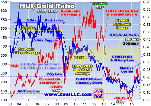And despite their enormous market-dominating gains in 2016 even now, the gold stocks remain radically undervalued relative to the metal which drives their profits. The easiest proxy for this relationship is the HUI/Gold Ratio, or HGR. Gold stocks still have big gains to come even to reflect today’s gold price, let alone where this gold bull is heading in the future. The gold miners’ upside potential from here is great.