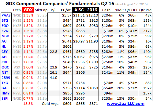 I last did this fundamental analysis of GDX’s top 34 components 3 months ago, looking at Q1’16 data. It’s really illuminating to see trends evolve quarter-on-quarter. Interestingly the big gold-stock gains in Q2 were not increasingly concentrated in these major gold miners dominating GDX’s weighting. The top 34 accounted for 96.7% of its total weight a quarter ago, but only 91.9% today. That’s likely a bullish sign.