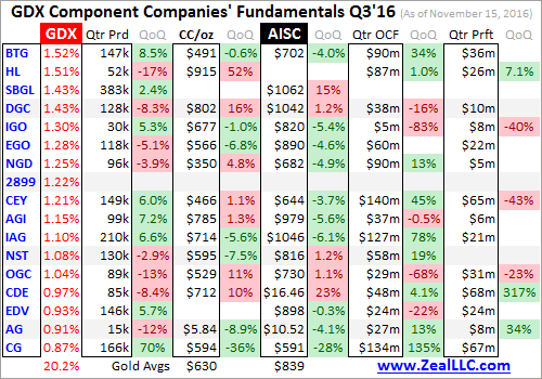 Collectively these top 34 GDX-component stocks account for 90.1% of GDX’s total weighting, a commanding sample. While the great majority of these companies’ Q3’16 results were released on time, a few didn’t make that 45-day cutoff. GDX includes foreign miners trading in Australia, the UK, and Hong Kong, which report in half-year increments instead of quarterly. So the Q3 results they released varied widely.