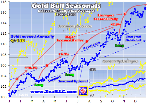 So the modern bull-year seasonality relevant to this new bull year in 2016 ran from 2001 to 2012, before the Fed-induced bear-market years between 2013 to 2015. This first chart distills down gold’s bull-year seasonal tendencies, by averaging gold prices indexed within each calendar year. This methodology is essential because it renders price percentage moves perfectly comparable despite differing prevailing gold prices.