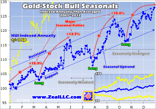 So during its bull-market years, gold has always tended to enjoy massive autumn rallies driven by these sequential episodes of outsized demand. Naturally the gold stocks follow gold higher, amplifying its gains due to their profits leverage to the gold price. Today gold stocks are once again right at their most-bullish seasonal juncture, the transition between the usually-drifting summer doldrums and big autumn rallies.