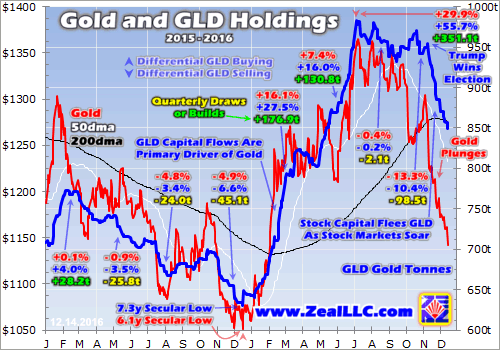 Leading into last December’s first Fed rate hike in nearly a decade, stock investors liquidated their gold exposure via GLD shares as evidenced by falling holdings. GLD is a tracking ETF, designed to mirror the gold price. Since GLD-share supply and demand is totally independent from gold’s own, the only way GLD can accomplish its mission is if excess GLD-share supply or demand can be shunted into gold itself.
