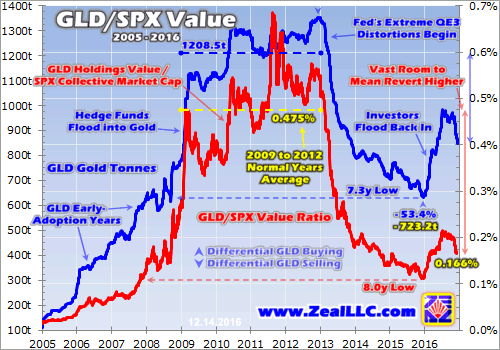 This last chart looks at a proxy for gold investment by American stock investors, the guys responsible for the lion’s share of 2016’s gold bull. It compares the total value of GLD’s gold-bullion holdings with the collective market capitalization of all 500 elite S&P 500 stocks. Dividing these numbers and charting the results over time reveals when gold is really in favor or out of favor, great times to sell high or buy low respectively.
