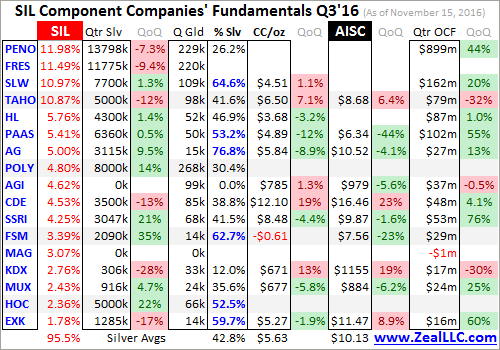 Nevertheless SIL is what we’ve got, so I’ve spent recent weeks digging into the Q3’16 10-Q reports filed by this ETF’s top 17 components. That number was chosen because that many stocks fit neatly into the table below. But as these silver miners command fully 95.5% of SIL’s weighting, they are essentially all that matters. Every quarter I collect a bunch of key data for each, and feed it into a spreadsheet for analysis.