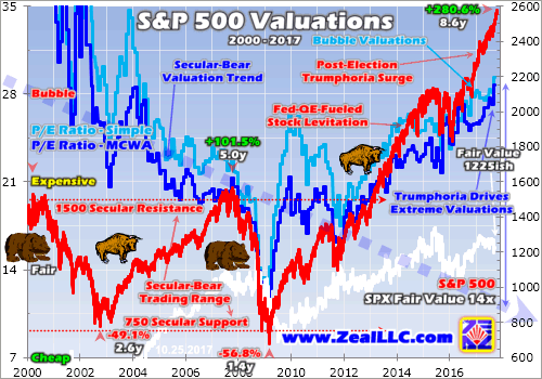 If this radically-unprecedented transition from extreme easing to extreme tightening was happening in normal fairly-valued stock markets, it would still ominously portend a major bear. But thanks to these goofy central banks artificially enlarging and prolonging this stock bull through their QE, stocks have soared way up to bubble valuations! The extreme overvaluation rampant in stock markets today greatly magnifies the risks.