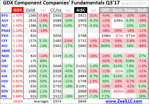 In these tables the first couple columns show each GDX component’s symbol and weighting within this ETF as of this week. While most of these gold stocks trade in the States, not all of them do. So if you can’t find one of these symbols, it’s a listing from a company’s primary foreign stock exchange. That’s followed by each company’s Q3’17 gold production in ounces, which is mostly reported in pure-gold terms.