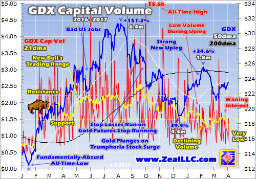 Despite GDX soaring 34.6% in less than 2 months, which was far better than other sectors buoyed by all the Trumphoria, capital volume fell under its bull-market support. By late February it had crumbled below $1.3b on a 21dma basis! Those were the worst levels in a year, since the early weeks of gold stocks’ young new bull when it still remained unproven. This week GDX capital volume slumped back near $1.3b.