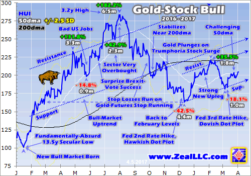 Gold stocks have been left behind by the wild Trumphoria stock-market rally over the past 5 months. As of the middle of this week, the benchmark S&P 500 stock index is up 10.0% since Election Day. But the gold stocks as measured by their flagship HUI index are down 1.1% over that span. The gold stocks have really suffered since the election, which explains the stubbornly-bearish sentiment plaguing them today.