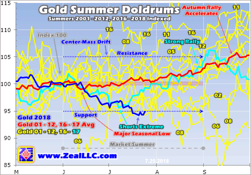And this summer that is certainly lower. This first chart is another update from my latest research on gold’s summer-doldrums trading range published in early June. Gold tends to drift sideways to lower in market summers in bull-market years, this is its weakest time of the year seasonally. But this year’s gold action is worse than usual, slightly below support in recent weeks. Extreme gold-futures shorting is to blame.