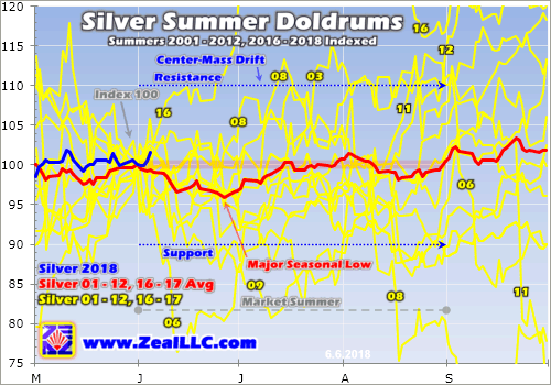 While there are outlier years, gold generally drifts listlessly in the summer doldrums much like a sailing ship trapped near the equator. The center-mass drift trend is crystal-clear in this chart. The vast majority of the time in June, July, and August, gold simply meanders between +/-5% from May’s final close. This year that equates to a probable summer range between $1233 and $1363. Gold tends to stay well within trend.