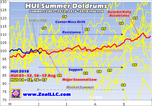 The gold miners’ stocks are also hostage to gold’s summer doldrums. This last chart applies this same analysis to the flagship HUI gold-stock index, which is closely mirrored by that leading GDX VanEck Vectors Gold Miners ETF. The major gold stocks tend to leverage gold’s gains and losses by 2x to 3x, so it’s not surprising that the HUI’s summer-doldrums-drift trading range is also twice as wide as gold’s own.