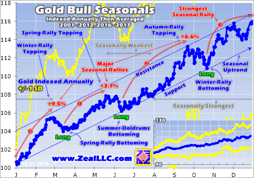 Prevailing gold prices varied radically throughout these modern bull-market years, running between $257 when gold’s last secular bull was born to $1894 when it peaked a decade later. All these years along with gold’s latest bull since 2016 have to first be rendered in like-percentage terms in order to make them perfectly comparable. Only then can they be averaged together to distill out gold’s bull-market seasonality.