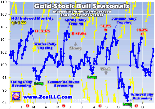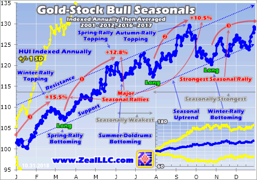 Between 2001 to 2012 and 2016 to 2017, the HUI averaged hefty 4.2% gains in November. That ranks as their 4th-best month of the year. Then like and because of gold, there is a winter-rally lull in December which retreats to 2.4% average gains. But gold stocks tend to power higher early in new years, with a return to strong 3.9% average gains in January. The winter rally is finally capped by February’s beast-mode surge.
