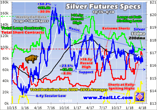 That adds up to colossal silver-futures buying potential of 114.0k contracts over the next half-year or so. That’s the equivalent of a staggering 570m ounces of silver, or nearly 2/3rds of the latest read on annual world silver mine production! The potential silver upside that would be fueled by silver-futures buying of this magnitude is enormous. I suspect the resulting silver bull will dwarf the last +50.2% one in 2016’s first half.