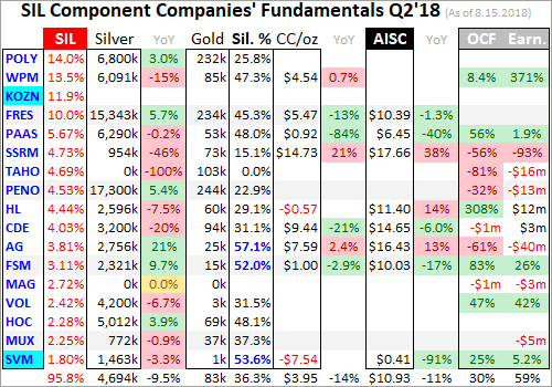 While most of these top 17 SIL components had reported on Q2’18 by mid-August, not all had. Some of these major silver miners trade in the UK or Mexico, where financial results are only required in half-year increments. If a field is left blank in this table, it means that data wasn’t available by the end of Q2’s earnings season. Some of SIL’s components also report in gold-centric terms, excluding silver-specific data.