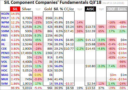 While most of these top 17 SIL components had reported on Q3’18 by mid-November, not all had. Some of these major silver miners trade in the UK or Mexico, where financial results are only required in half-year increments. If a field is left blank in this table, it means that data wasn’t available by the end of Q3’s earnings season. Some of SIL’s components also report in gold-centric terms, excluding silver-specific data.
