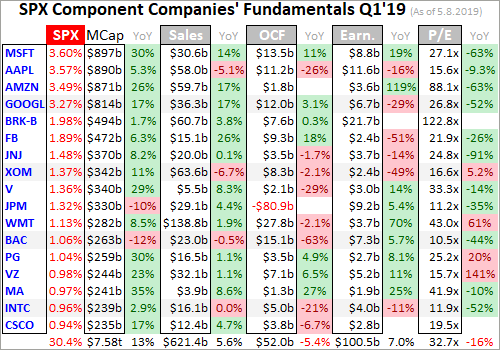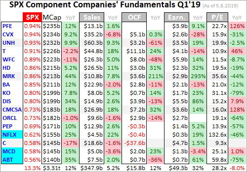 I wade through the 10-Q or 10-K SEC filings of these top SPX companies for a ton of fundamental data I feed into a spreadsheet for analysis. The highlights make it into these tables below. They start with each company’s symbol, weighting in the SPX and SPY, and market cap as of the final trading day of Q1’19. That’s followed by the year-over-year change in each company’s market capitalization, an important metric.