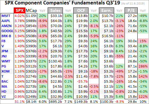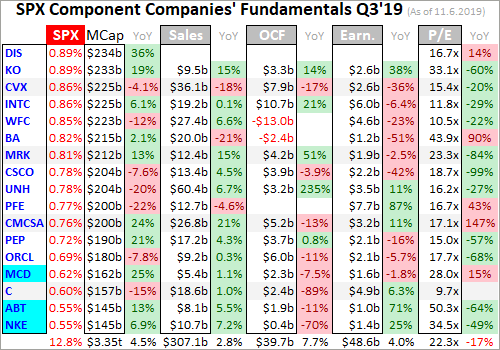 I wade through the 10-Q or 10-K SEC filings of these top SPX companies for a ton of fundamental data I feed into a spreadsheet for analysis. The highlights make it into these tables below. They start with each company’s symbol, weighting in the SPX and SPY, and market cap as of the final trading day of Q3’19. That’s followed by the year-over-year change in each company’s market capitalization, an important metric.