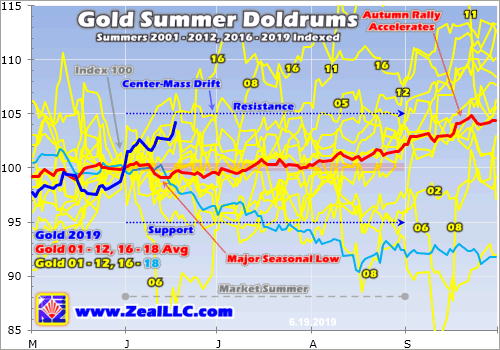 That reveals the center-mass drift trend of gold in market summers, which include June, July, and August proper. Gold’s current 2019 summer action is superimposed over all that history in dark blue. At least as of gold’s $1360 Wednesday close following the FOMC, it was only up 4.2% summer-to-date. That is still within the typical gold summer trend of +/-5% from May’s close. This gold summer rally is big, but not extreme.