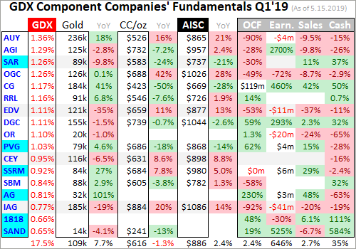 The first couple columns of these tables show each GDX component’s symbol and weighting within this ETF as of this week. While most of these stocks trade on US exchanges, some symbols are listings from companies’ primary foreign stock exchanges. That’s followed by each gold miner’s Q1’19 production in ounces, which is mostly in pure-gold terms. That excludes byproduct metals often present in gold ore.