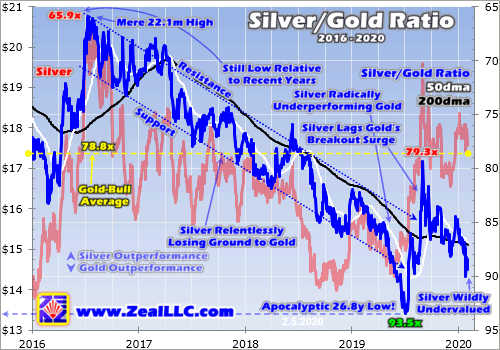 Because silver sentiment stayed bearish, silver certainly didn’t proportionally mirror gold’s latest new highs on China’s coronavirus breakout. So by late January, the SGR had collapsed all the way back down to 90.0x. That’s not far above last summer’s extreme quarter-century-plus lows. And remember they helped unleash silver’s last upleg. Silver still needs to mean revert far higher relative to today’s gold prices!