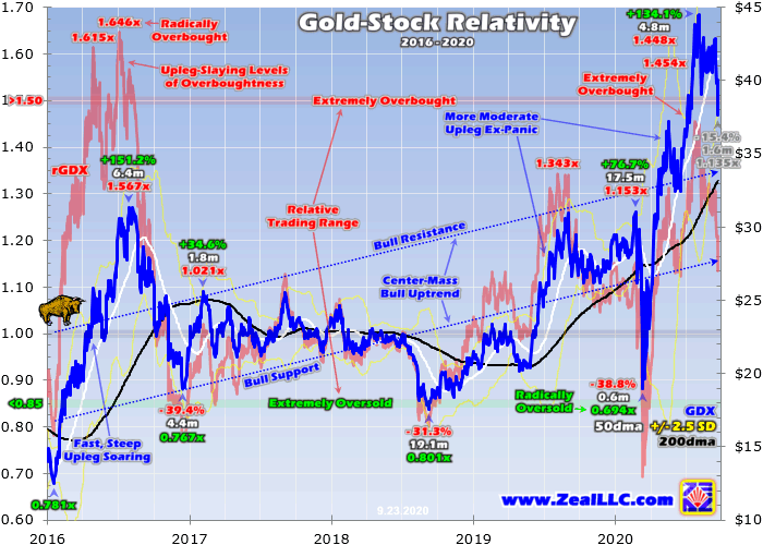 But it is hard to imagine the gold stocks not at least returning to GDX’s 200dma after blasting higher in their second-biggest upleg of this bull. Again that would make for a 25.5% GDX correction this week, but GDX’s 200dma continues to gradually rise. Relativity charts effectively collapse 200dmas horizontal to 1.00x, and render all the price action meandering around them in perfectly-comparable percentage terms.