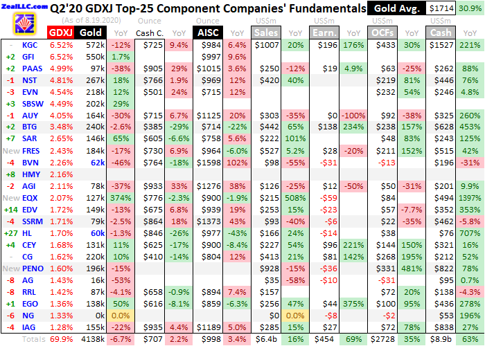 Their hard financial results reported to securities regulators, under Generally Accepted Accounting Principles or their foreign equivalents, proved outstanding in Q2 despite the operational challenges from governments’ lockdowns. The GDXJ top 25’s total revenues grew 15.7% YoY to $6.4b. And those are actually really understated, because of that financial-reporting delay authorized by South Africa’s regulators.
