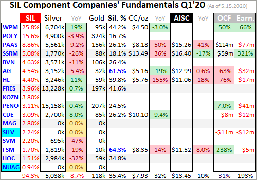 The major silver miners’ Q1’20 results were released against this vexing backdrop of underperformance. After every quarterly earnings season, I wade through the latest results from the top 17 SIL silver stocks. That’s simply an arbitrary number that fits neatly into the table below, but still represents a commanding 94.3% of SIL’s total weighting. Given the COVID-19 disruptions, these results were exceptionally important.