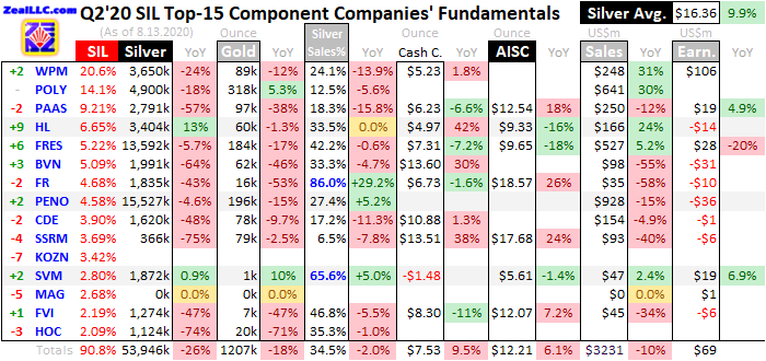 This was my 17th quarter in a row analyzing how the world’s biggest and best silver miners are faring fundamentally. While SIL included 27 component stocks in mid-August as Q2’s earnings season was wrapping up, I limited my research to its top 15 holdings. They commanded a dominant 90.8% of SIL’s total weighting. These silver giants mostly trade on stock exchanges in the US, UK, Canada, and Mexico.