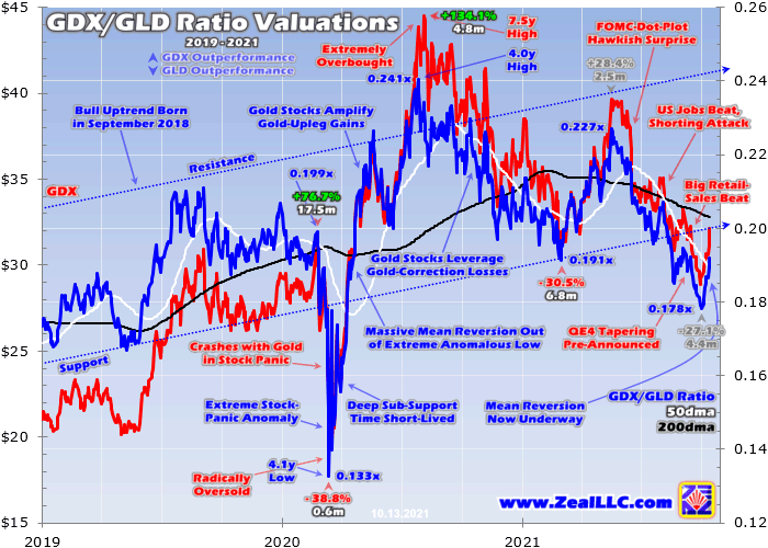 Gold stocks’ short-term upside potential is also massive on mean-reversion-relative-to-gold potential. As this chart shows, the GGR has been grinding higher on balance in a secular uptrend in recent years. This is normal during secular gold bulls, as the longer they persist the more traders migrate into gold stocks to ride them. The GDX/GLD Ratio plunged as low as 0.178x as October dawned and traders rushed to sell low.
