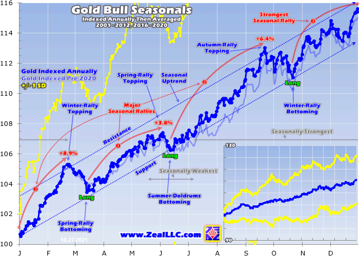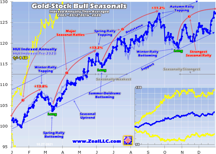 This chart averages the individually-indexed full-year gold performances in those bull-market years from 2001 to 2012 and 2016 to 2020. 2021 isn’t included yet since it remains a work-in-progress. This bull-market-seasonality methodology reveals that gold’s strongest seasonal rally by far is its winter one which tends to start in late October! That portends big gains in coming months from selloff-depressed gold stocks.