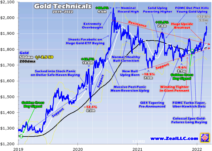 That afternoon, the US government declared Russia had formally made the decision to invade Ukraine! Putin was ready to unleash the immense military firepower he had painstakingly amassed around that adjacent country. Those troubling tidings of war ignited enormous gold-futures buying, catapulting gold 2.0% higher that day to $1,864! That geopolitical surge achieved a huge and important upside breakout.