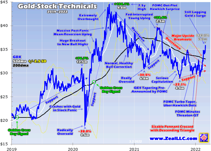 The bottom line is gold and gold stocks just enjoyed big upside breakouts. The proximate driver was Russia-invading-Ukraine fears, but both the metal and miners had well-established young uplegs running for months before Putin went off the rails. That geopolitical shock accelerated buying, and the resulting gold and gold-stock surges are very important technically for attracting more traders and capital to this sector.