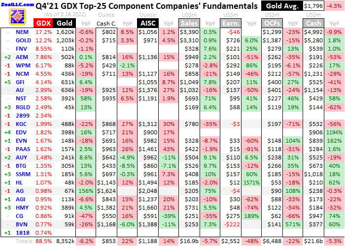 This table summarizes the operational and financial highlights from the GDX top 25 during Q4’21. These gold miners’ stock symbols aren’t all US listings, and are preceded by their rankings changes within GDX over this past year. The shuffling in their ETF weightings reflects shifting market caps, which reveal both outperformers and underperformers since Q4’20. Those symbols are followed by their current GDX weightings.