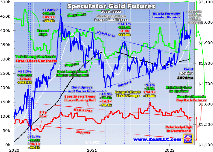 So as late as mid-February, Russia invading Ukraine wasn’t priced into most markets. Still at that point gold’s young upleg had already powered 8.5% higher over 4.5 months. Despite that relentless drumbeat of Fed uber-hawkishness, spec gold-futures buying played a major role. In that pre-invasion span, they sold 14.2k long contracts but bought to cover 35.5k short ones for gold-equivalent buying of 66.2 metric tons.