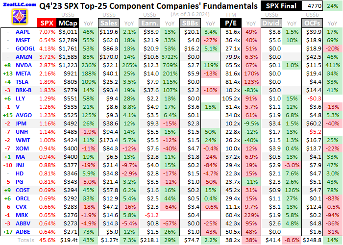 As always big US stocks’ latest Q4’23 results are important for gaming stock markets’ likely direction in coming months. For 26 quarters in a row now, I’ve analyzed how the 25 largest US companies that dominate the SPX fared in their latest earnings seasons. These behemoths commanded a stunning near-record 45.6% of the SPX’s total market cap exiting Q4! Their latest-reported key results are detailed in this table.