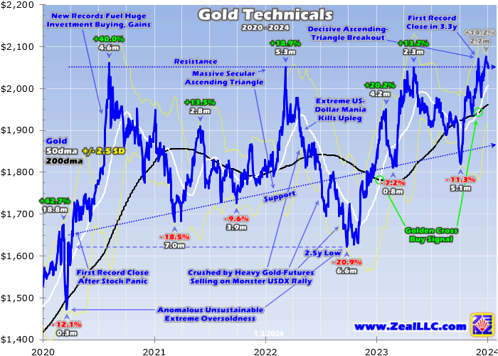 So gold’s record breakout upleg is very much alive and well, and poised to really grow in 2024. Over the past few years or so, gold has carved a massive secular ascending-triangle technical formation. These classic continuation patterns are very bullish, as upside breakouts attract buying amplifying their gains. Gold’s little pullback over this past week is hardly noticeable, a trivial blip in this impressively-bullish chart.