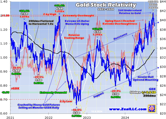 But despite gold growing really overextended, gold stocks are not since they have lagged their metal so much this year. This chart divides GDX by its own 200-day moving average, creating an overbought-and-oversold indicator I call the Relative GDX. This renders gold-stock moves in constant-percentage terms around a 200dma flattened to horizontal at 1.00x. Over time this rGDX indicator tends to form trading ranges.