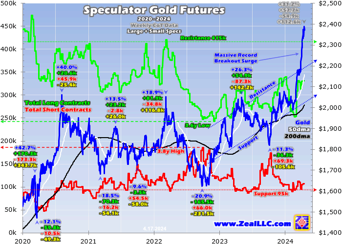 Over three CoT weeks from March 26th to April 16th, gold rocketed 9.7% higher to $2,388! That was nearly 4/10ths of gold’s now 31.2% total upleg gains rapidly accruing in just 1/10th of that upleg’s span. But the thing transforming this exploding breakout surge into remarkable was gold’s normal drivers weren’t responsible. Two of these last three CoT weeks have been reported, with the third due out late Friday.