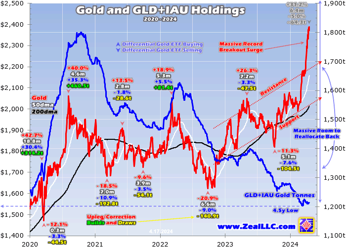 The longer stock markets grind lower on balance while gold forges higher, the more attractive it will grow to mainstream investors. So I fully expect American stock investors’ gold demand to return soon, for them to flood into GLD and IAU shares forcing big holdings builds. They have massive room to reallocate back in, and that normal stage-three buying will drive gold much higher. That’s because of how ETFs work.