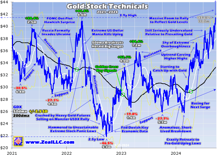 Interestingly despite vexingly lagging gold this past year, gold-stock doublings are still a thing. Since this secular gold bull was born in late September 2022, GDX has powered up 89.3%. That compares to gold’s +64.0% at best in that span, making for modestly-better 1.4x upside leverage. Yet driven by gold-stock sentiment, sector performance can turn on a dime. GDX would only need a couple months to fully catch up.