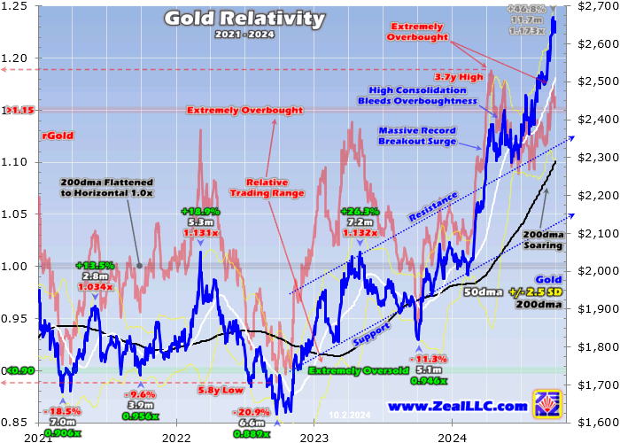 If that 92k contracts of long buying catapulted gold from $2,388 to $2,662, the coming proportional gold-futures selling could force gold similarly lower. That was about $275 up, and a comparable $275 down would make for a 10.3% correction. Seeing sub-$2,400 gold soon wouldn’t be seriously damaging technically, but would wreak havoc on sentiment. The recent popular greed would fast give way to widespread fear.