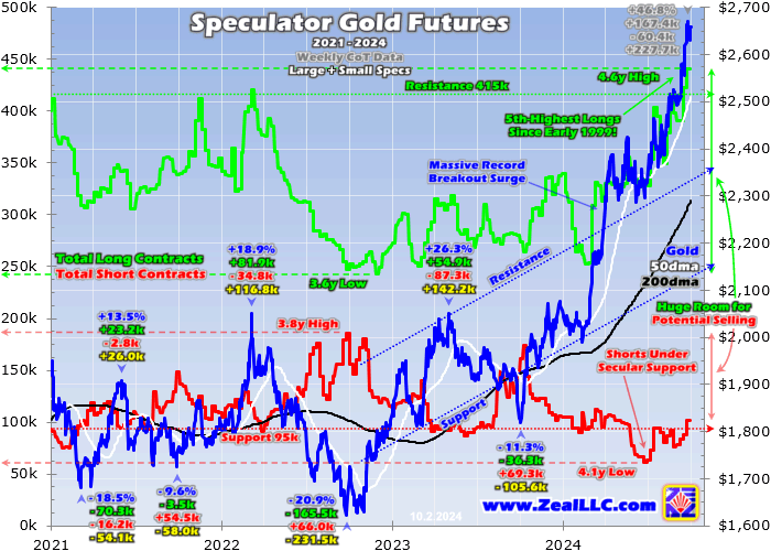 This next chart is far scarier than the last, looking at speculators’ overall gold-futures positioning in recent years. That data is only published weekly in the famous Commitments of Traders reports, current to Tuesday closes but not released until late Fridays. So the latest-available CoT data before this essay was published was as of September 24th. Gold surged to its latest nominal record of $2,662 that day.
