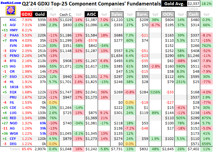 This table summarizes the GDXJ top 25’s operational and financial highlights during Q2’24. These gold miners’ stock symbols aren’t all US listings, and are preceded by their rankings changes within GDXJ over this past year. The shuffling in their ETF weightings reflects shifting market caps, which reveal both outperformers and underperformers since Q2’23. Those symbols are followed by their recent GDXJ weightings.