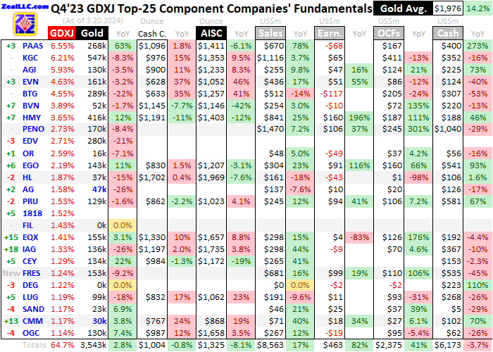 This table summarizes the GDXJ top 25’s operational and financial highlights during Q4’23. These gold miners’ stock symbols aren’t all US listings, and are preceded by their rankings changes within GDXJ over this past year. The shuffling in their ETF weightings reflects shifting market caps, which reveal both outperformers and underperformers since Q4’22. Those symbols are followed by their recent GDXJ weightings.