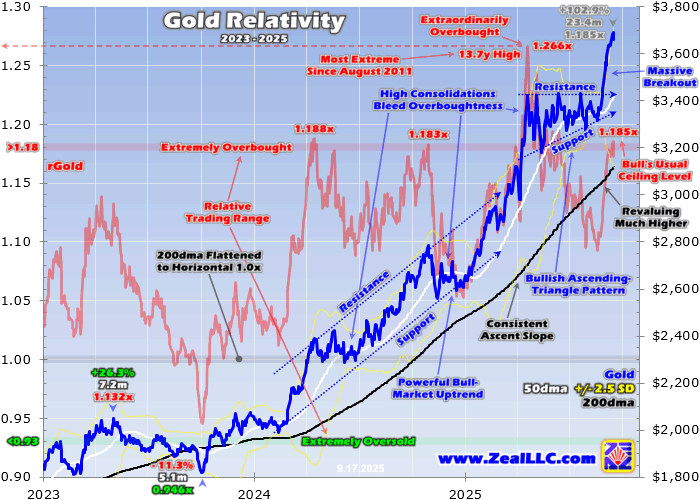But then in late-April 2025, gold didn’t stall at 18%+. In just under six weeks, gold soared 18.5% to a new record $3,421. Gold had so much upside momentum it didn’t stop until an astounding 1.266x its 200dma! Those were dangerous crazy-overbought levels, as I warned in another essay that very week. That was so wild I did a study of every gold bull and bear, and every upleg and correction, since way back in January 1971.