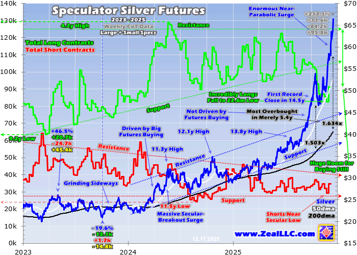 Silver already surged much higher then, just over $51. Yet speculators still had huge room for buying since spec longs were so far under resistance! The last time they had been that low was in mid-January 2024 early in silver’s bull. Silver was under $23 then, and would soar 45% into mid-April that year on massive spec silver-futures long buying. As this chart shows, spec longs shot to a 4.2-year high in that span.