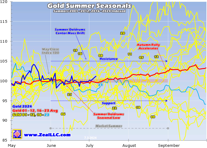 This chart is updated from that latest gold-summer-doldrums essay. It individually indexes all modern gold-bull years’ summers, setting May’s final close to 100. That renders them in perfectly-comparable percentage terms despite very-different gold levels. Then all 20 of these summer gold performances are averaged together in the red line, distilling out summer seasonals. 2024’s action is superimposed in dark blue.