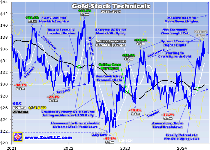 Yet despite GDX’s limitations, it still has lots of ground to regain to reflect these record prevailing gold prices. Today’s mighty gold upleg is the biggest by far since a pair of monsters crested in 2020, at huge 42.7% and 40.0% gains! Those were also gold’s last uplegs achieving new record highs, which creates a powerful record-momentum dynamic. That is well underway in today’s upleg, and continues to strengthen.
